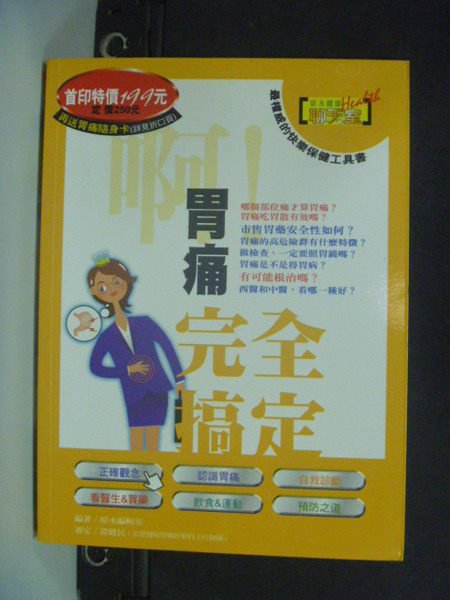 | 購買 全店購物滿 1000 元(含)以上免運費 【書寶二手書T6/養生_LQS】啊!胃痛完全搞定_原水編輯室:100069716955,店家為 書寶二手書店 | 樂天市場購物網 - 台灣 售價:39 我要購買 | ||