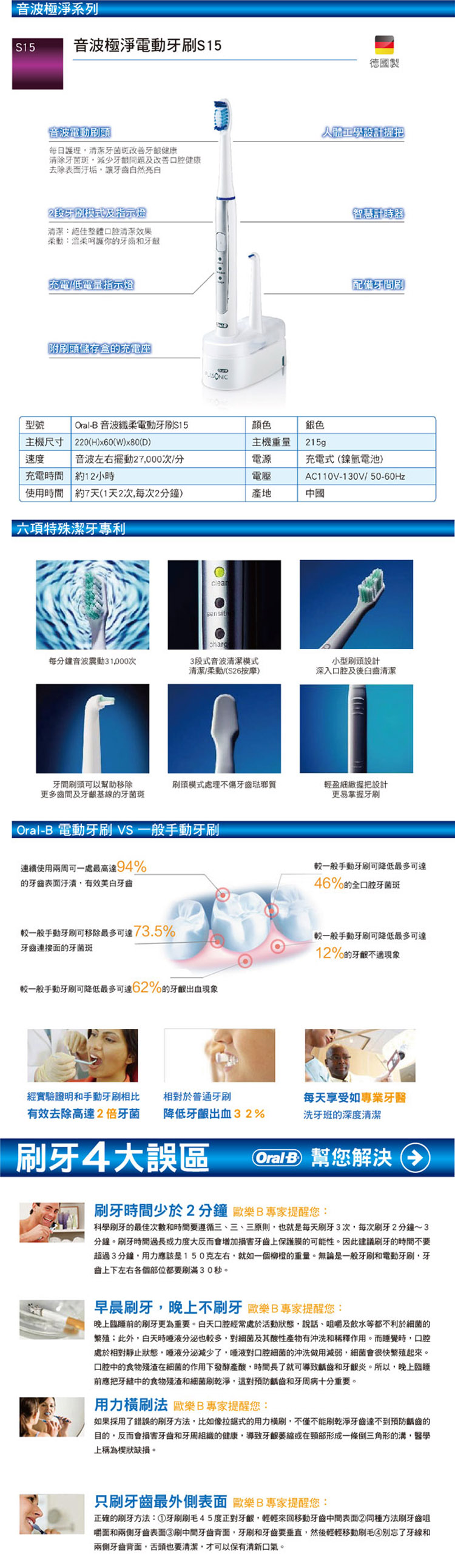 ![]() 2種刷牙模式:清潔與柔動內附2支聲波刷頭 專業計時器, 2分鐘計 每分鐘左右震動27,000次 充電器與刷頭儲存座 |