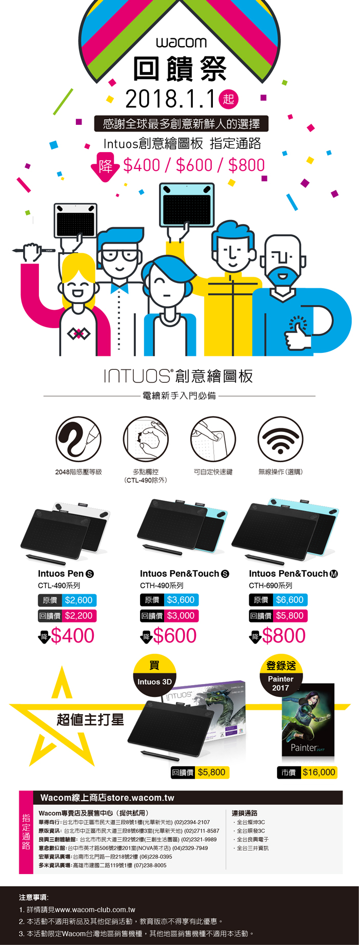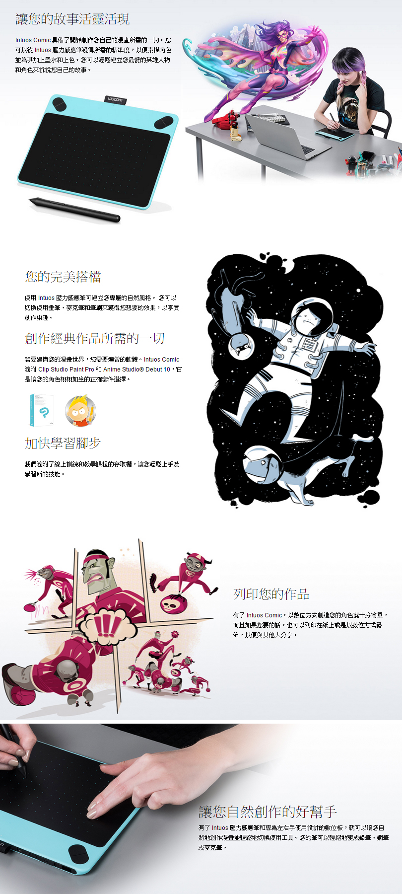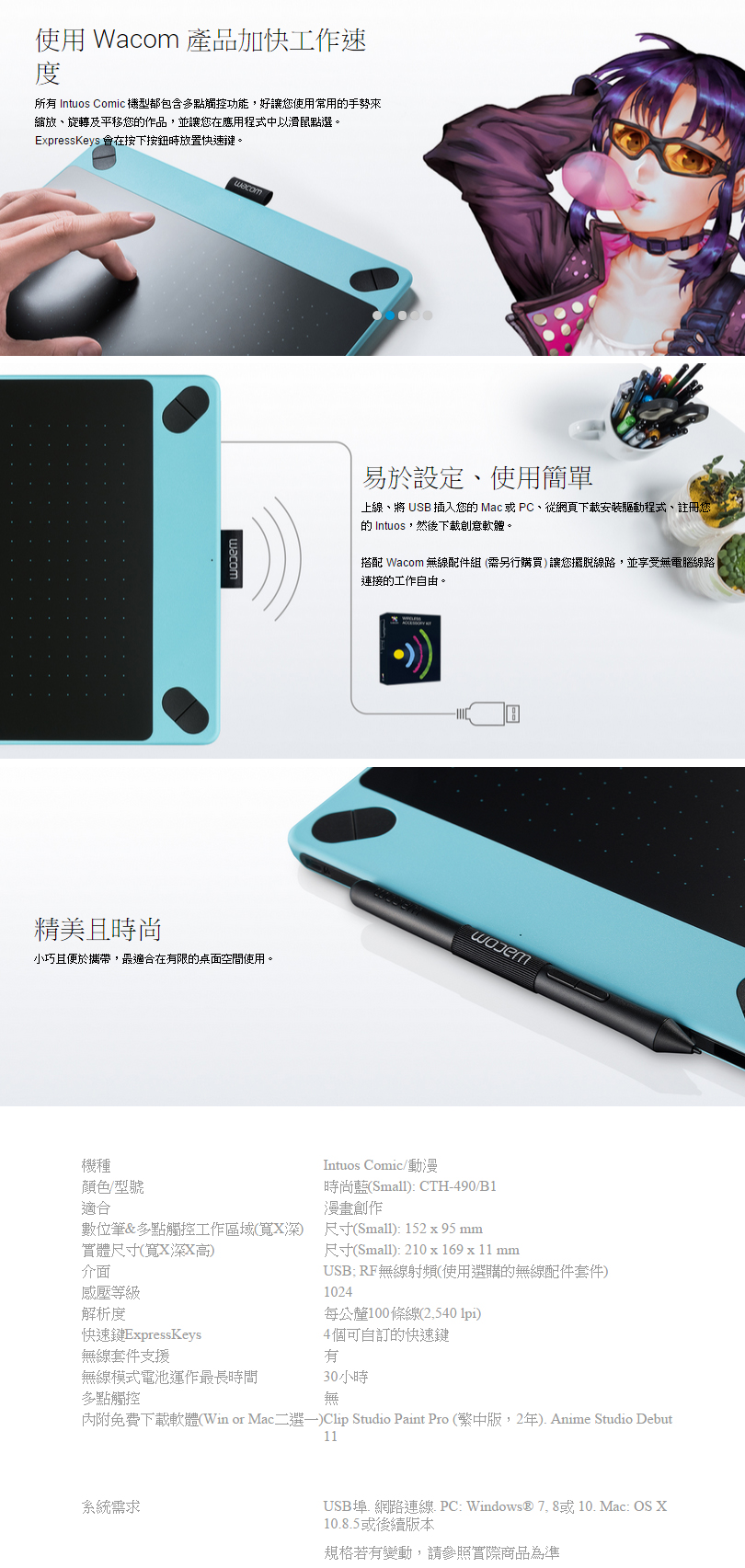 商品規格 支援介面:USB 感壓尺寸:152 x 95 mm 解析度:2540 lpi 感壓級數:1024 保固:1年 Clip Studio Paint Pro 2年 (繁中) 專業漫畫繪製軟體 Anime Studio Debut 11 商品說明